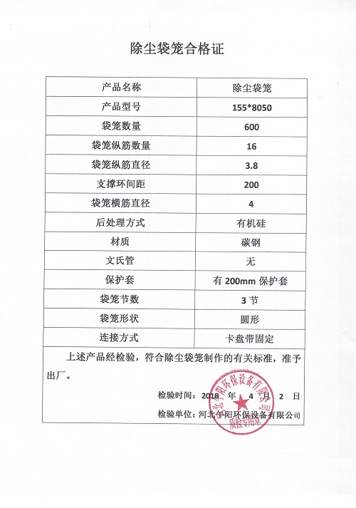 鋼廠(chǎng)除塵器改造案例@除塵袋籠出廠(chǎng)檢驗(yàn)合格證明
