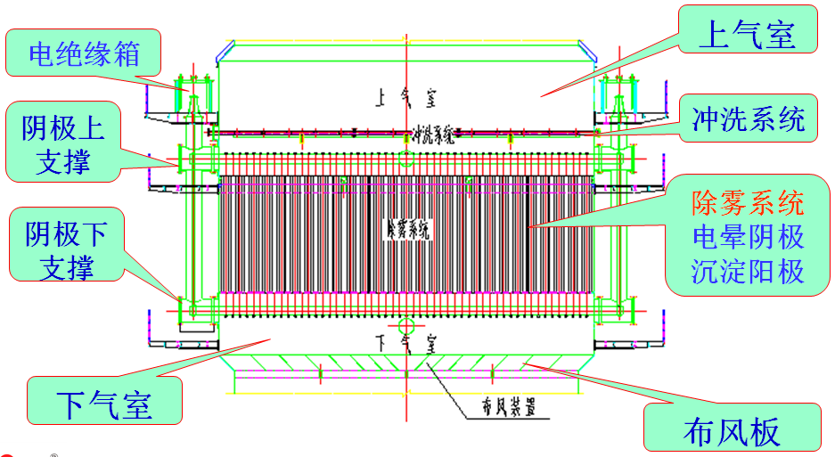 分為:沖洗裝置、上氣室、電絕緣箱、電暈電_裝置、沉淀電_裝置與支撐結(jié)構(gòu)、氣體分布裝置、下氣室、高壓靜電裝置。