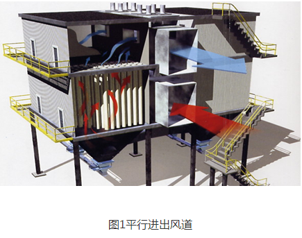 含塵氣體從箱體側(cè)向進(jìn)入除塵器,再經(jīng)過煙氣分配裝置側(cè)向進(jìn)氣,均勻分配含塵氣體,可對大直徑固體顆粒進(jìn)行粗分離,但由于氣流側(cè)向沖擊濾袋,導(dǎo)致濾袋碰撞磨損,使用壽命縮短。