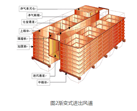 圖2是在圖1的基礎(chǔ)上又進(jìn)行了優(yōu)化,如圖所示,在進(jìn)風(fēng)風(fēng)道中增設(shè)斜向?qū)Я靼澹粍t減緩氣流流速,利于大顆粒物分離,二則使氣流縱向分布_趨向均勻,減少了大型渦流的產(chǎn)生,減輕了“二次揚(yáng)塵”,從而減少濾袋磨損,提高除塵效率,簡化維護(hù)事項(xiàng),節(jié)約運(yùn)行及維護(hù)成本。