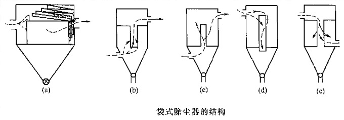 圖中(b)、(c)、(d)、(e)均為圓袋式除塵器,濾袋形狀為圓筒形,直徑一般為120~300mm,_不_過600mm;高度為2~3m,也有10m以上的。由于圓袋的支撐除塵骨架及連接較簡單,清灰容易,維護管理也比較方便,所以應(yīng)用非常廣泛。