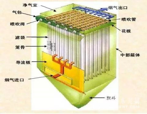 含塵氣體由除塵器進(jìn)風(fēng)口進(jìn)入中、下箱體、含塵氣體通過(guò)濾袋進(jìn)入上箱體過(guò)程中,由于濾袋的各種效應(yīng)作用將塵氣分開(kāi),粉塵被吸附在濾袋上,而氣體穿過(guò)濾袋經(jīng)文氏管進(jìn)入上箱體,從出風(fēng)口排出。含塵氣體通過(guò)濾袋凈化,隨著時(shí)間的增加而積附在濾袋上的粉塵越來(lái)越多,增加了濾袋的阻力, 致使通過(guò)濾袋氣體量逐漸減少。為使阻力控制在限定范圍內(nèi)(一般為 1176-1470)Pa,保持所需氣體量通過(guò)由控制儀發(fā)出指令,按順序觸發(fā)各控制閥開(kāi)啟脈沖閥,氣包內(nèi)的壓縮空氣瞬時(shí)地經(jīng)脈沖閥至噴吹管的各孔噴出,再經(jīng)文氏管?chē)娚涞礁鲗?duì)應(yīng)的濾袋內(nèi)。濾袋在氣流瞬間反向作用下急劇膨脹,使積附在濾袋表面的粉塵脫落,濾袋得以再次工作。被清掉的粉塵落入灰斗,經(jīng)排灰閥排出機(jī)體。積附在濾袋上的粉塵被周期地脈沖噴吹清理,使凈化的氣體正常通過(guò),_除塵系統(tǒng)正常運(yùn)行。