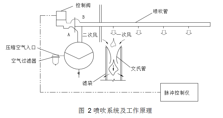脈沖閥噴吹口處于半閉狀態(tài);當(dāng)控制儀發(fā)出信號(hào)時(shí)控制閥排氣口被打開(kāi)脈沖閥背壓室的氣體泄掉,壓力降低、膜片兩面產(chǎn)生壓差,膜片因壓差作用而產(chǎn)生位移,脈沖閥噴吹口打開(kāi),此時(shí)壓縮空氣從氣包經(jīng)過(guò)脈沖閥經(jīng)噴吹管小孔噴至文氏管進(jìn)入濾袋(從噴吹管?chē)姵龅臍怏w為一次風(fēng))。當(dāng)高速氣流通過(guò)文氏管誘導(dǎo)數(shù)倍于一次風(fēng)的周?chē)諝猓ǚQ(chēng)為二次風(fēng))。造成濾袋內(nèi)瞬時(shí)正壓。實(shí)現(xiàn)清灰。