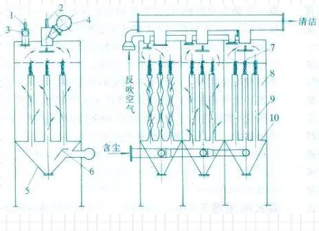 其中常用的是反吹風(fēng)清灰方式,他是利用大氣或者風(fēng)機排出管道吸入氣體而形成反向氣流,利用反向風(fēng)速和振動,來使得沉積的粉層塵脫落。此清灰方式常用的是編織布濾料或使用過濾粘類濾料,容易清落的粉塵。反吹清灰方式的清灰作用比較弱,但要對濾布的損傷作用比振動清灰方式要小,所以,一些柔軟的濾料,如玻璃纖維濾布多采用這種清灰方式。