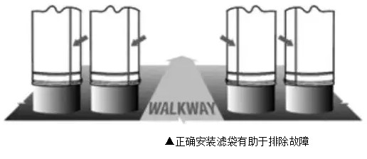應檢查折疊在支撐籠頂部的帶法蘭或袖口的布袋邊緣是否平滑,以防止泄漏和布袋磨損。底部裝載袋上的接縫應與籠圈上的裂縫或間隙成180°。這些布袋上的夾子應該相對于布袋上的接縫安裝90°,并且位于袋籠的凹槽中。頂部進入脈沖噴射裝置的卡扣袋應安裝在接縫全部朝向相同的方向。這樣可以識別發(fā)生問題的區(qū)域,并_設備的故障排除。