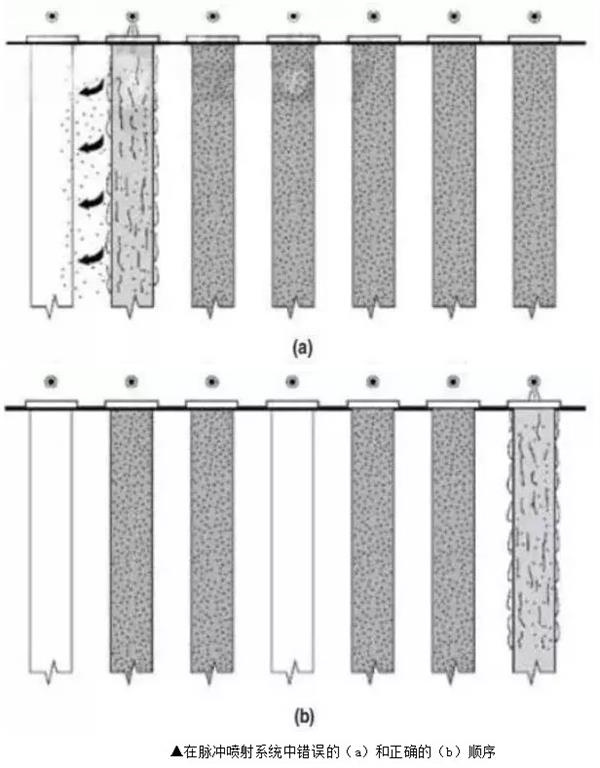 清潔順序可以在減少物料重新夾帶方面發(fā)揮重要作用。在另一行旁邊脈動一行(按順序排列)可能會導致精細的亞微米材料遷移到已清潔的行。交錯排列的脈沖順序可以_濾餅的過濾效果。一個例子是脈沖行1,然后行4,7,10,13,16,2,5,8,11,14等,直到整個系統(tǒng)已被清理。
