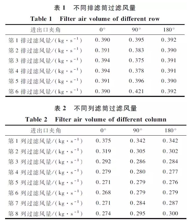 探索不同進(jìn)出口夾角對(duì)濾筒除塵器氣流分布均勻性的影響,采用進(jìn)出口夾角為0°、90°和180°3種出口形式進(jìn)行模擬分析,分別從不同排和不同列的濾筒過(guò)濾風(fēng)量和綜合流量分配系數(shù)的角度對(duì)比得出:出口位置會(huì)致與之鄰近的濾筒的過(guò)濾風(fēng)量的提高。